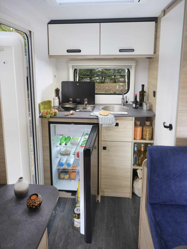 Die 460CP setzt auf Ausgewogenheit: ein echtes, leicht zugängliches zentrales Bett, eine praktische Heckküche für den Zwischenstopp, ein Badezimmer mit allem Komfort und eine umwandelbare Dinette, die eine zusätzliche Schlafgelegenheit bietet. Ein effektiver Grundriss, der sowohl Anfängern als auch erfahrenen Nutzern gefällt.