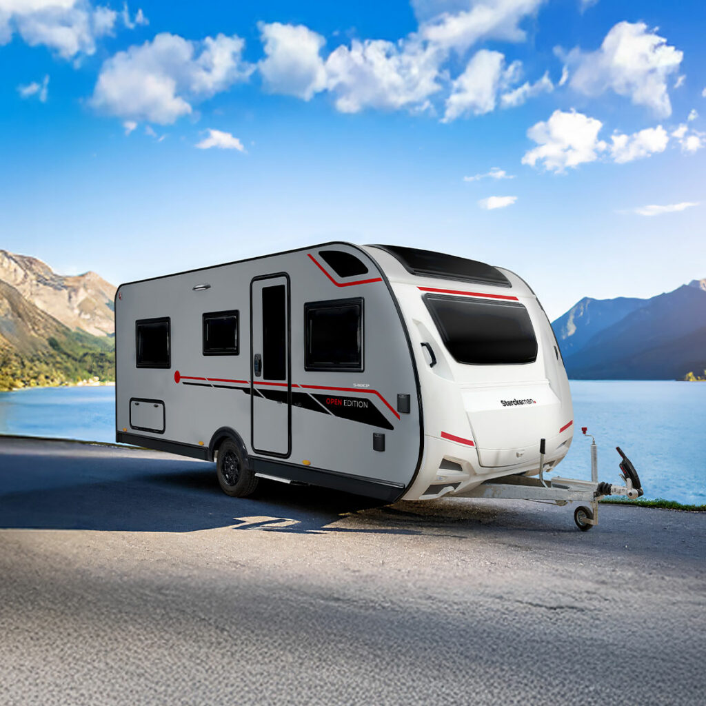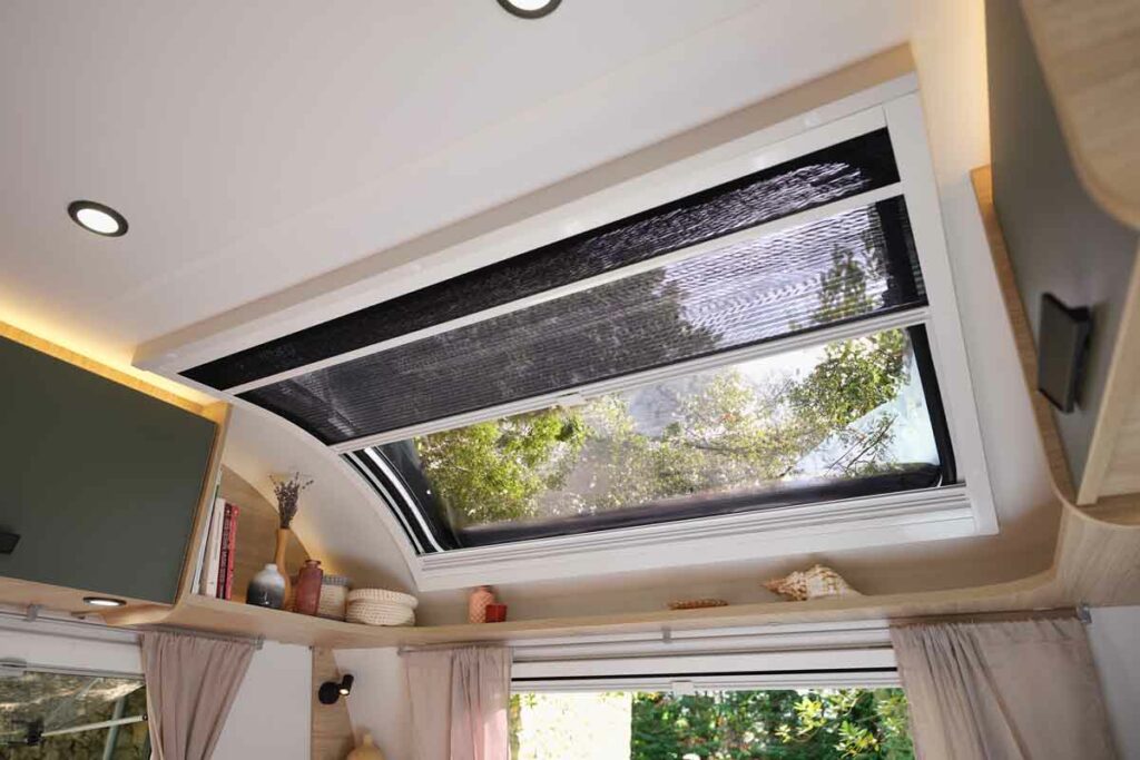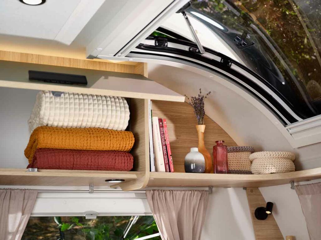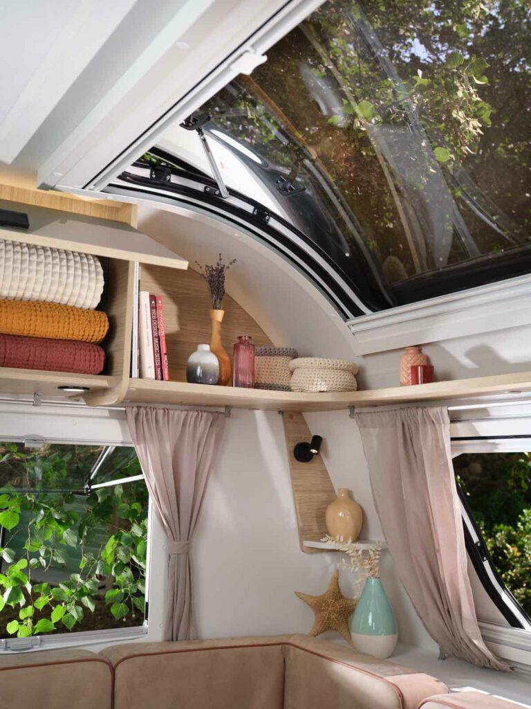 Neben den Einzelbetten und dem Badezimmer bietet dieser 5,60 m lange Wohnwagen auch ein Wohnzimmer mit Rundsitzgruppe und einen Kleiderschrank
